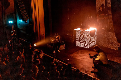 The idea was for a cube that could be positioned in the center of the stage, serving as a symbolic "campfire," but could also be raised and hover above the band. For this purpose, I designed a pattern for the side elements that complemented the band's style and added a lively, fiery touch with the "dancing" line. The underside of the cube is inspired by the view one has when looking up at the sky between the trees and then looking down at the treetops.